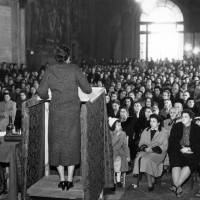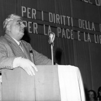 PARTECIPARE LA DEMOCRAZIAPalazzo d’Accursio ospita numerose iniziative politiche promosse dalle donne bolognesi, in primis quelle comuniste e dell’Unione Donne Italiane. Tra queste spiccano incontri e manifestazioni realizzate negli anni Cinquanta sul tema della pace, dalla raccolta di firme per l’Appello di Stoccolma contro la bomba atomica, alle mobilitazioni contro la guerra di Corea. Iniziative periodiche come la “settimana della pace” si sviluppano tra anni Quaranta e Cinquanta, per impulso delle donne ma con una collaborazione stretta con il movimento dei Partigiani della pace, a cui aderisce anche il sindaco di Bologna Giuseppe Dozza. Quest’ultimo venne definito a più riprese “il sindaco delle donne”, proprio per il suo impegno nella promozione di politiche attente ai loro bisogni, fino all’istituzione nel 1956 dell’assessorato “ai problemi femminili”, affidato alla dirigente e intellettuale comunista Mirella Bartolotti. Palazzo d’Accursio è frequentemente la sede di iniziative legate all’8 marzo, alle quali prendono parte dirigenti locali dell’UDI e figure di rilievo nazionale, come la parlamentare comunista Nilde Iotti, a lungo dirigente anche dell’UDI nazionale.